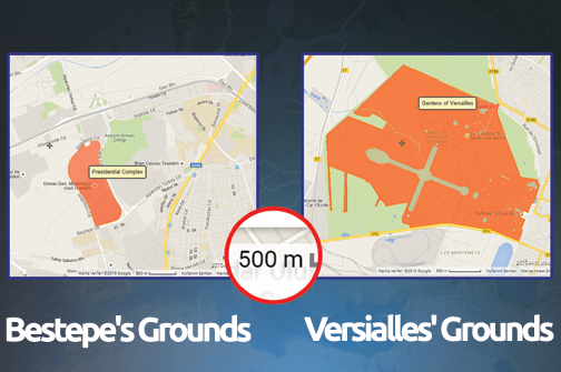 وفي الادعاءات بخصوص فرساي فبتلر على خطأ، حيث تتضمن أراضي فرساي حدائق وقناة وإجمالها 787 هكتار، وفقاً للموقع الرئيسي لقصر فرساي على شبكة النت. والمساحة الأرضية للقصر وحده هي 6.7 هكتار. بينما أرض مجمع بيستيبي الرئاسي المبني حديثاً في أنقرة مساحتها 75 هكتار. والمساحة الأرضية للمبنى الرئيسي الذي يتضمن مكتب الرئيس ما يقارب الهكتار الواحد. وإذا تم إضافة مساحات المباني الجنوبية والشمالية فإجمالي المساحة الأرضية أقل من 4 هكتارات. والفرق في الحجم أيضاً واضح في عدد الغرف حيث يحتوي فرساي على 2,300 غرفة، بينما تحتوي ثلاثة مباني رئيسية في مجمع بيستيبي على 1,150 غرفة.
